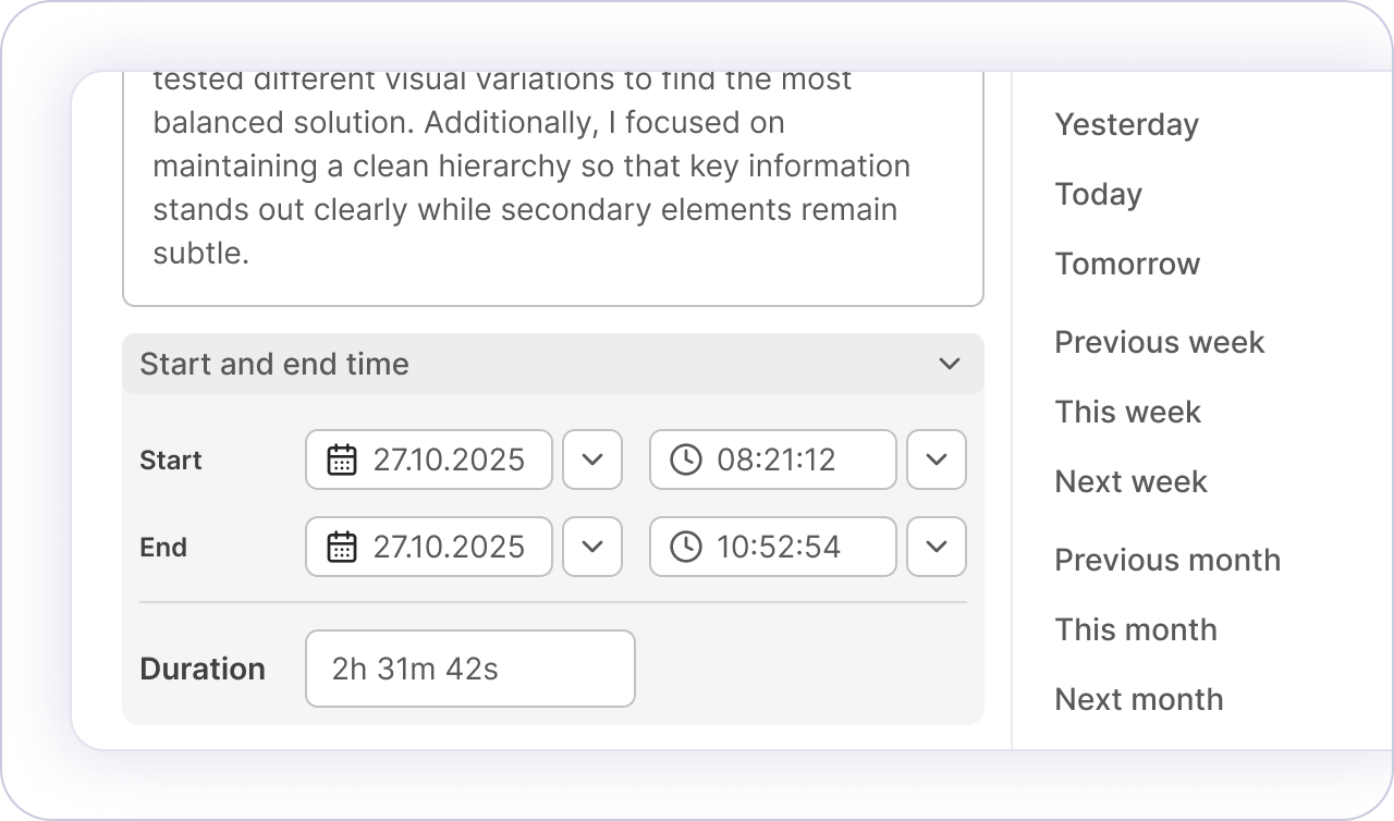 Review your automatically recorded activity and assign it to the right client, project, or task — with far more accuracy than reconstructing the day from memory alone.