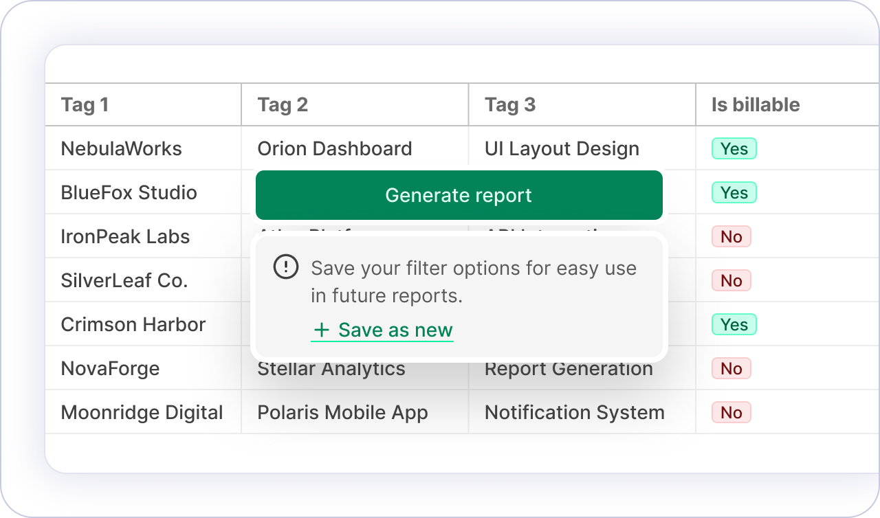 Assign time to client projects and internal work separately, so reports and invoices reflect only what should be billed.