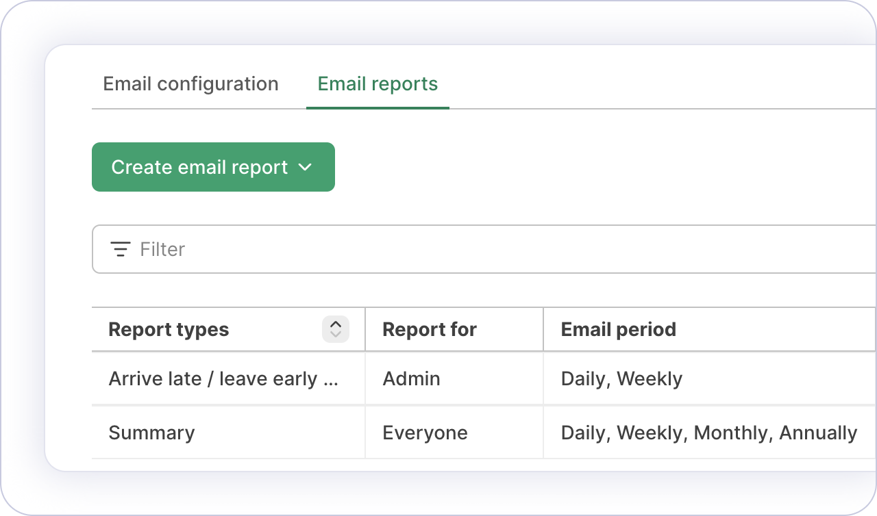 Configure who receives which report and how often — so finance gets overtime summaries, team leads get attendance signals, and individuals get their own worked-time breakdowns.