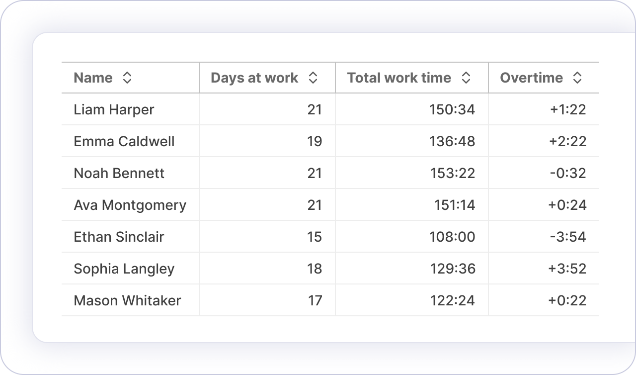 Overtime, productivity, attendance, app usage, and timesheets all pull from the same tracked data. There is no need to maintain separate systems for different reporting needs.