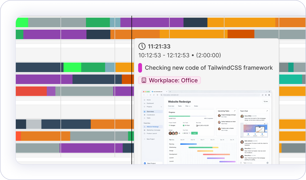 This makes it trivial to reconstruct your workday. Scroll through your timeline, see what was on your screen, and assign that time to the right project - all from a single view.