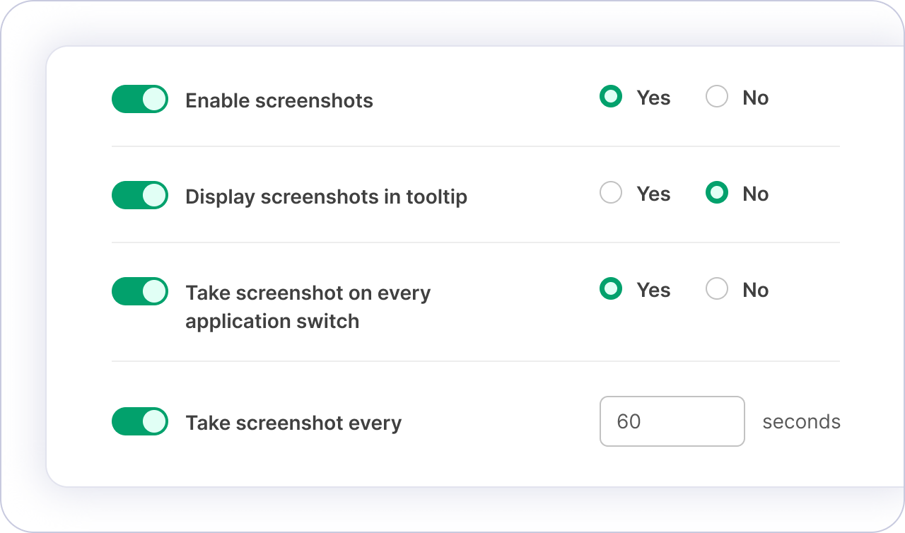 Choose which applications trigger screenshots, set capture frequency, or disable screenshots entirely. Administrators can configure policies per user or per team.