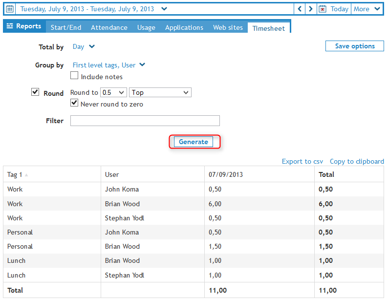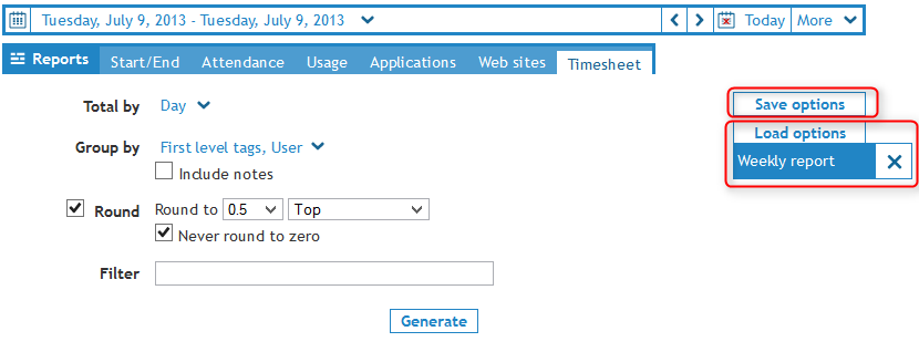 As on the client, you can also save timesheet settings, so you can reuse it later. Click on Save settings button to save it, then Load setting to use it later.