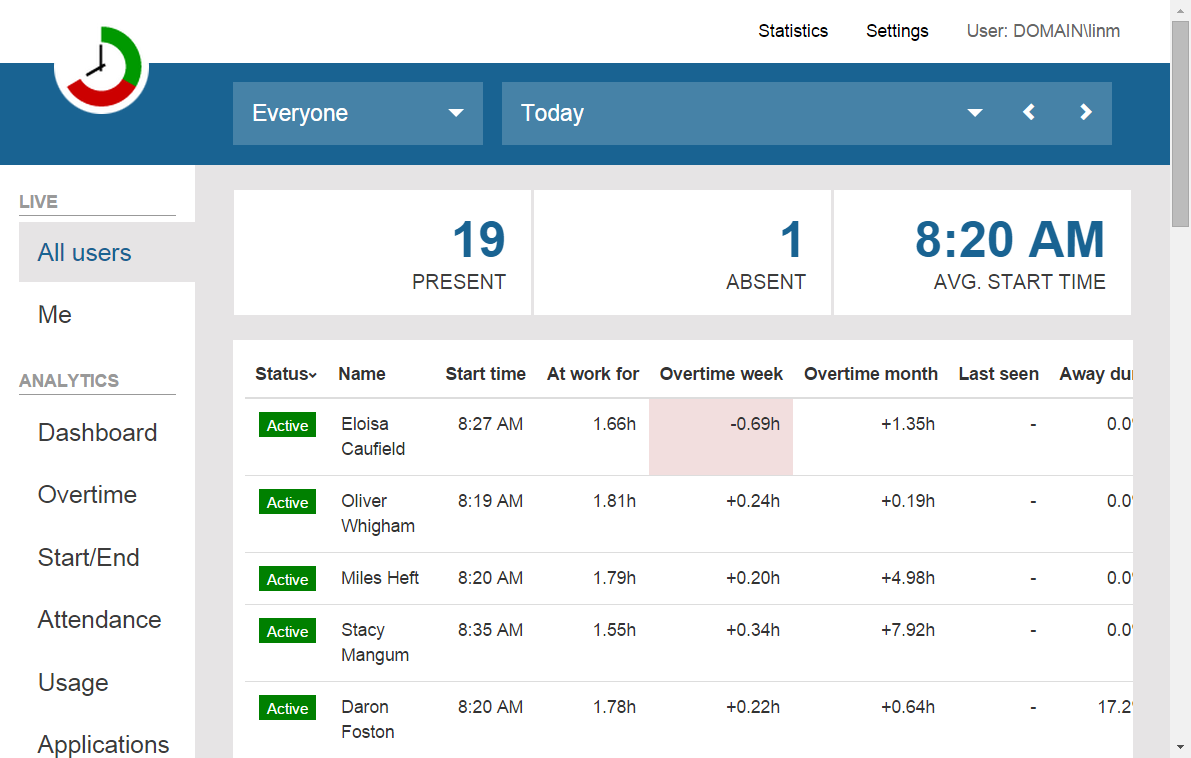 Personal shows information of currently logged in user only. It will show various information like overtime for week or month, daily start time and daily end time if you want to beat company average, your best, expected work time ....