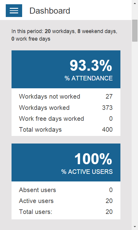 % Attendance = Number of days worked by any worker within the selected range / (Number of all work days * Number of all workers, which were active at least one day within selected range)