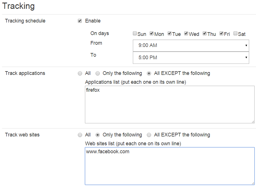 - Track applications - You can define which applications should be tracked (or you can define which should not be tracked and it will track all other)