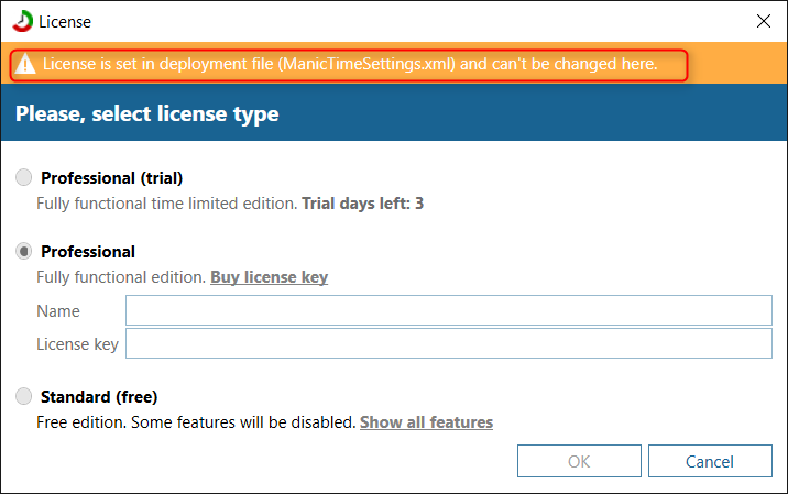 If license was set in ManicTimeSetings.xml, all controls in License window were disabled in previous version.