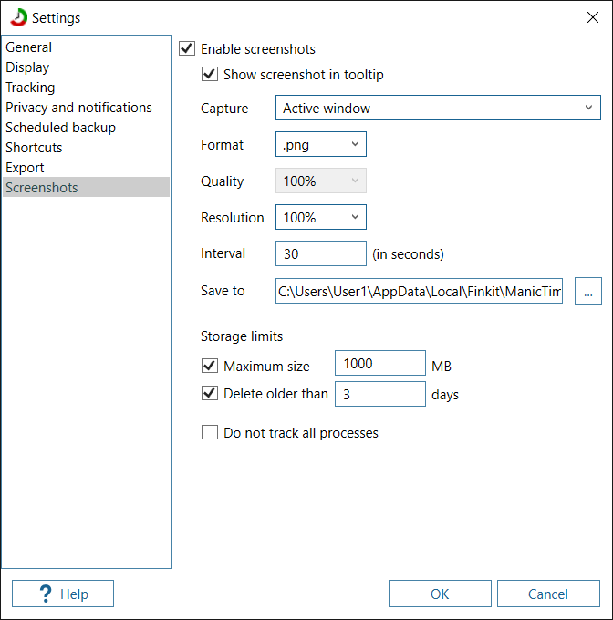 By default, ManicTime will take a screenshot every 30 seconds of all applications you use. You can restrict for which applications you'd like to have screenshots.