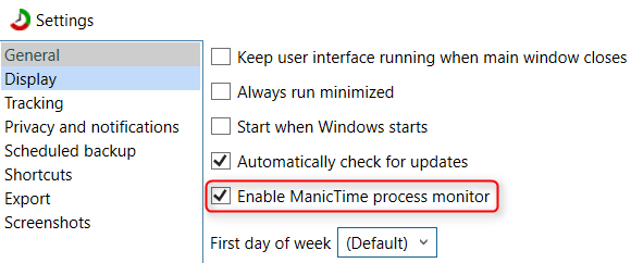 it does crash from time to time. If you enable this setting, a new process(ManicTimeProcessMonitor.exe) will be started when ManicTime starts.